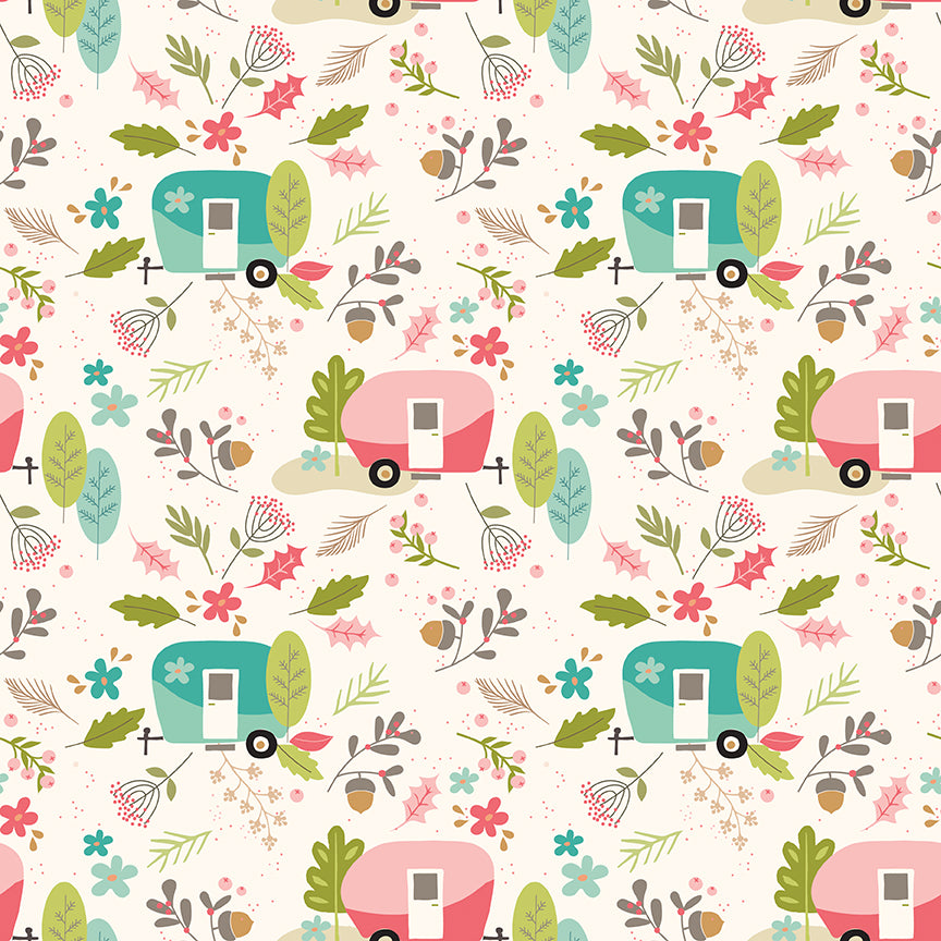 Glamp Camp by Minds Eye for Riley Blake in Main Cream. The cutest glampers which would make an amazing quilt backing. Perfect for quilting, clothing and home decor. This would make a really cute quilt backing!