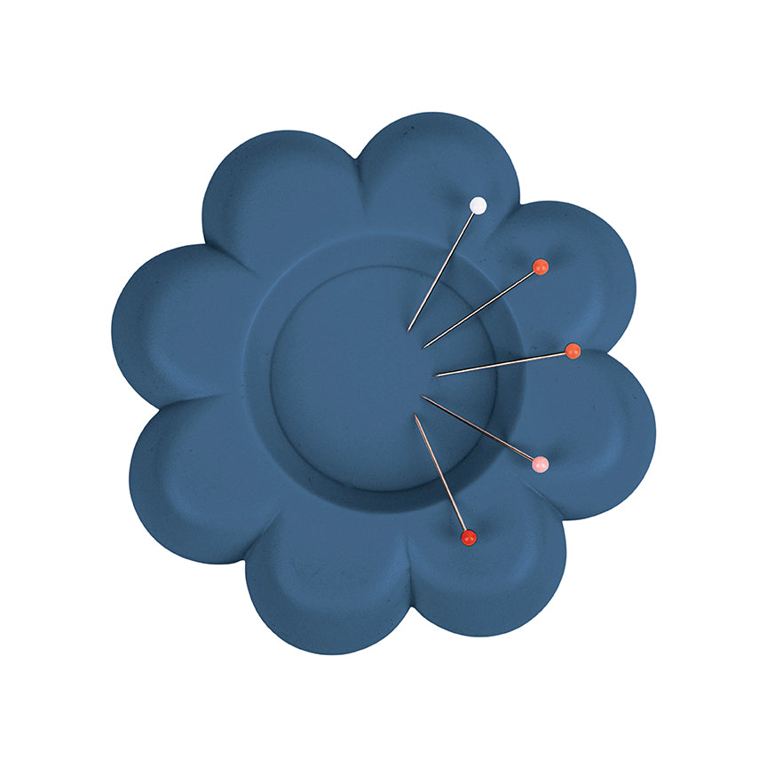 This is a magnetic pin dish in Lori's vintage style. The strong magnet easily collects and holds all your pins, needles and any small metal sewing notions. Flower power design in the denim colour. It will look sew cute in your sewing room!