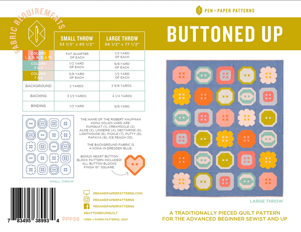 Buttoned Up is a traditionally pieced quilt recommended for the confident beginner quilter and up. The pattern includes instructions for making a large throw size (65.5" x 77.5") and a small throw size (53.5" x 65.5"). Buttoned up includes a bonus Heart Button block pattern as well! You can incorporate the block in your quilt top or use it for small projects such as mini quilts, tote bags and pillows.