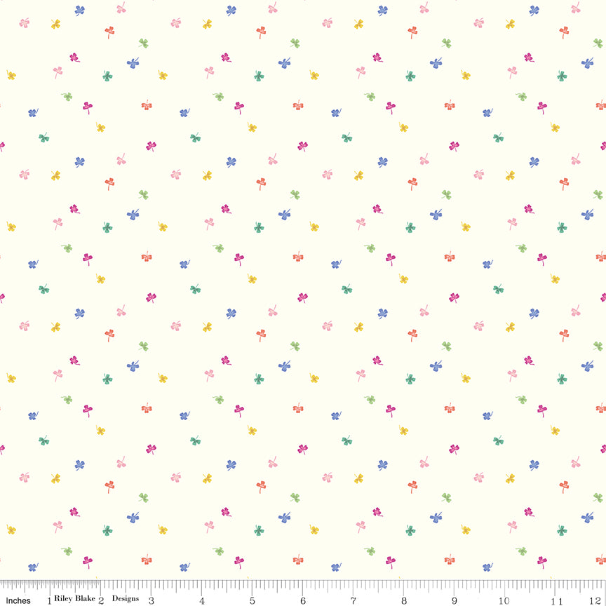 On a cream background this is a low-volume print of multi-coloured clovers.