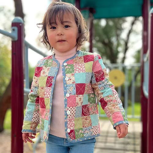 Crafted with care and creativity, this jacket is the perfect project for your growing scrap collection or an opportunity to choose coordinating fabrics for a personalised touch.